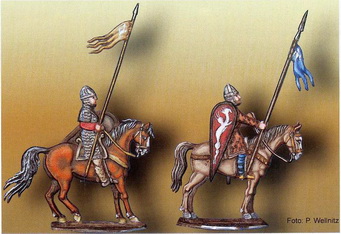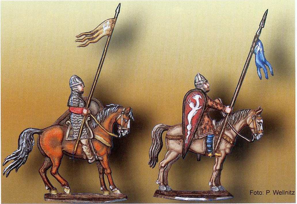 neueren Typ wie er Mitte des 11. Jahrhunderts zum Einsatz kam und zeigt typische Symbole der damaligen Zeit, die noch heidnischen Ursprungs sind und Dämonen und Wesen der Unterwelt darstellen. Des Weiteren gehören zu seiner Bewaffnung ein Schwert und eine Lanze mit einer Länge zwischen 2,2 Meter bis teilweise 2,5 Meter.