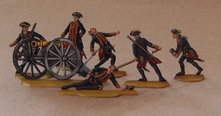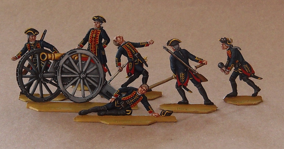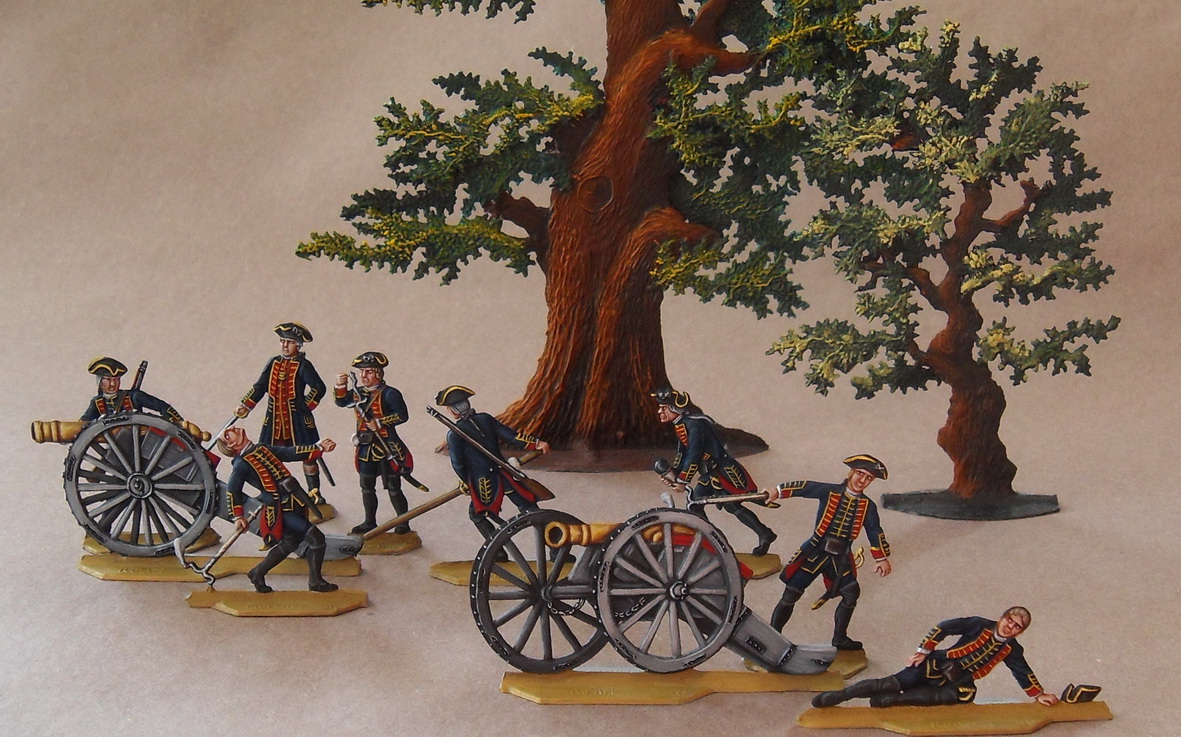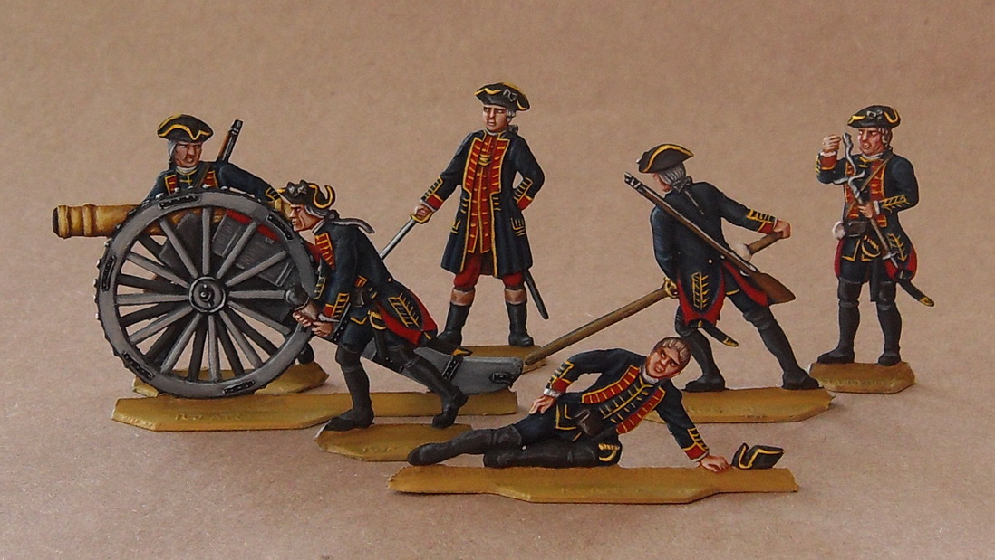 Es gibt eine neue Zinnfiguren-Kleinserie für den French and Indian War, den Konflikt der beiden europäischen Kolonialmächte in Nordamerika des 18. Jahrhunderts. Die Figurenserie besteht aus zwei Geschützen und zehn Artilleristen der Royal British Artillery im Feuerkampf, von denen fünf Zinnfiguren eine Variation der Körperhaltung anbieten. Die Figurenserie zeigt die Royal British Artillery im Kampf gegen die alliierten französischen, indianischen und kanadischen Truppen in der Schlacht am Monongahela.